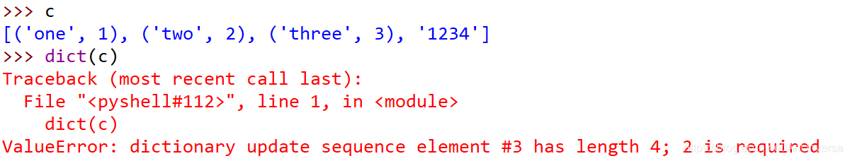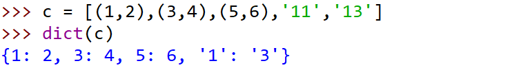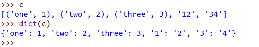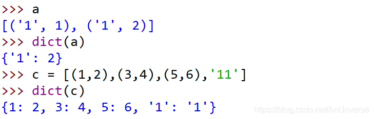 居然不报错,和我想得不太一样,心中想,dict函数的实现这么复杂吗,原以为只有简单的几种情况,于是,我又做了几次实验,如下: