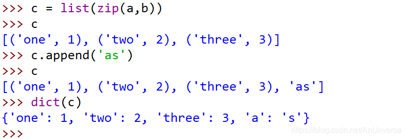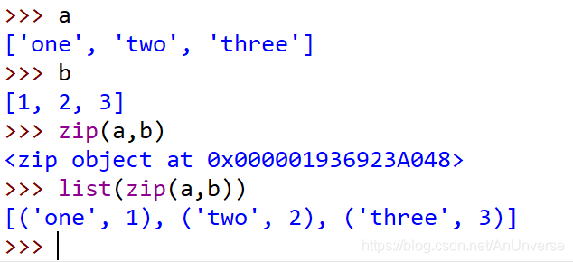 其中zip函数是用于将可迭代的对象作为参数,将对象中对应的元素打包成一个个元组,然后返回由这些元组组成的列表,如下: