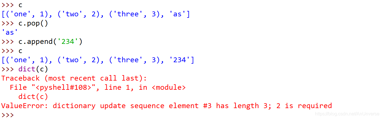 出现了上述的错误,翻译了一下大致是更新后的字典格式不符合字典的的形式,原本需要两个元素 ,现在给了它三个元素,他不知道怎么划分,我起初以为因为2是偶数,3是奇数,可能字符串中字符为偶数个时就可以正确分割,结果如下: