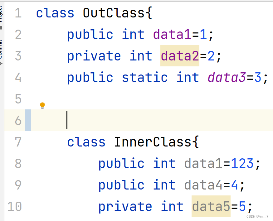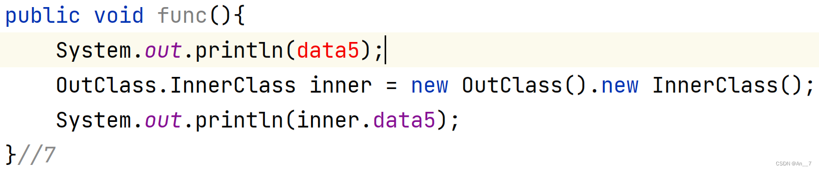 6:在外部类中,实例内部类外,访问实例内部类中的成员,必须要创建实例内部类对象。不创建实例内部类对象,程序报错。