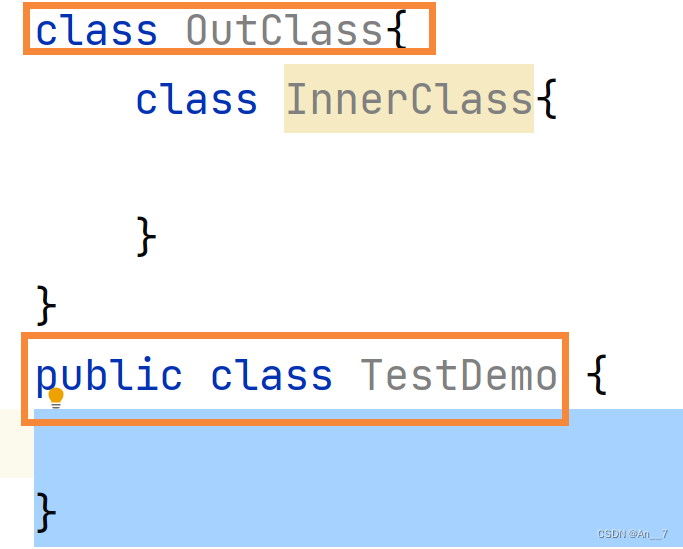 1.定义在class类名{}花括号外部的,即使是在一个文件里,都不能称为内部类。例如:用框框框起来的两个类,虽然在一个文件夹,但谁也不是谁的内部类。