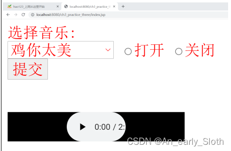 本文介绍了一个简单的音乐播放器界面实现方案,使用HTML和JSP技术允许用户选择背景图片和音乐文件,并控制音乐播放状态。通过预设选项,用户可以选择不同的音乐进行播放。