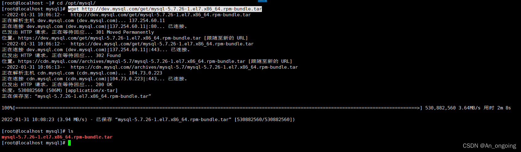 2、运行wget http://dev.mysql.com/get/mysql-5.7.26-1.el7.x86_64.rpm-bundle.tar下载mySQL安装包