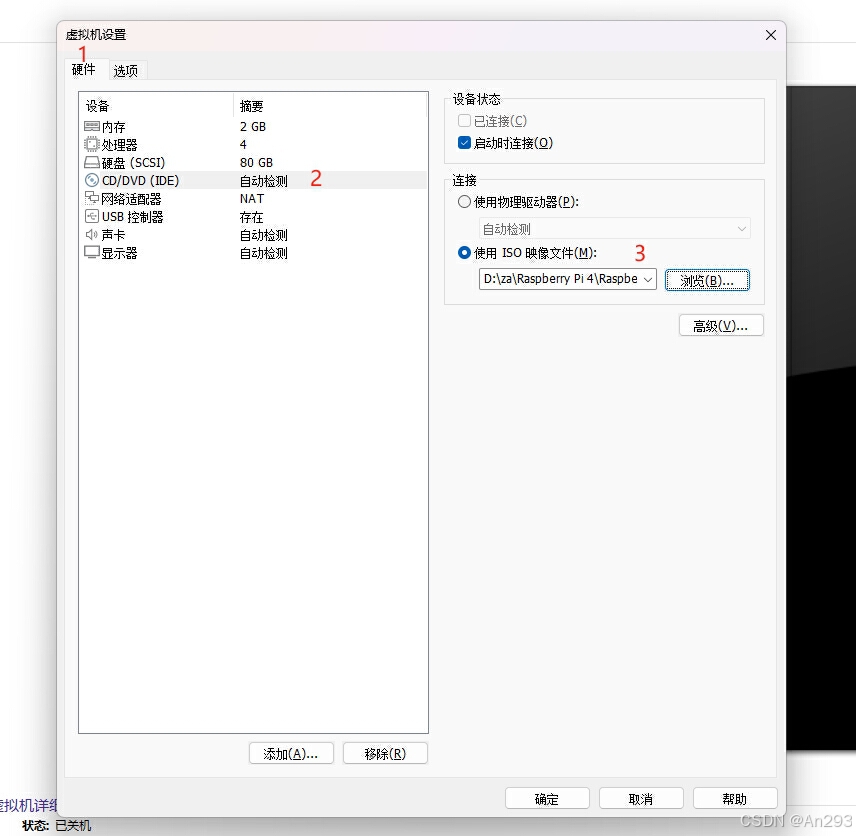 选择硬件 —— CD/DVD(IDE)—— 使用ISO映像文件,选择你放镜像文件的位置,点击确定