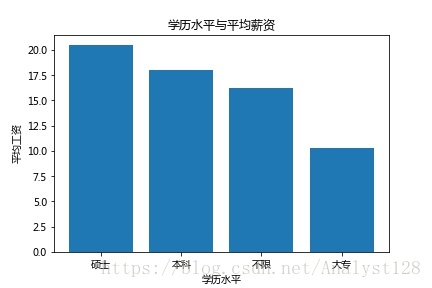 可以看出,数据分析师岗位学历水平与平均薪资成正比关系,学历越高,工资越高,硕士工资20k左右,本科平均工资17.5k左右,相差不大,但是大专学历平均工资却只有10k左右。差距较为明显。平时好好学习还是有一定好处的(哈哈)。