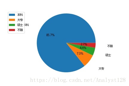 由下图比例可以看出,招聘单位85.7%要求入门是本科学历,本科学历数据分析岗市场需求量第一,大专学历7.3%排名第二,相应的硕士学历反而要求不高。也从间接的方面看出,公司可能更看重数据分析的经验能力。
