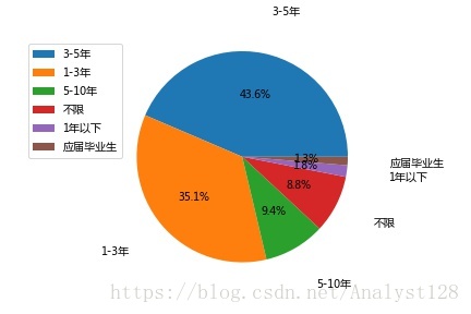 表中可以看出工作经验与职位需求成正比关系。3-5年和1-3年的数据分析师岗位需求量最大,前者占比43.6%,后者占比35.1%,说明数据分析岗位更看重数据分析经验。企业所需培养的成本相对较小,所以企业更愿意招揽此类人才。相对应的,经验过少和5-10年的工作者是两个极端,无工作经验或者1年以下的求职者培养起来需要更大的成本。后者则需要更大的招聘成本。