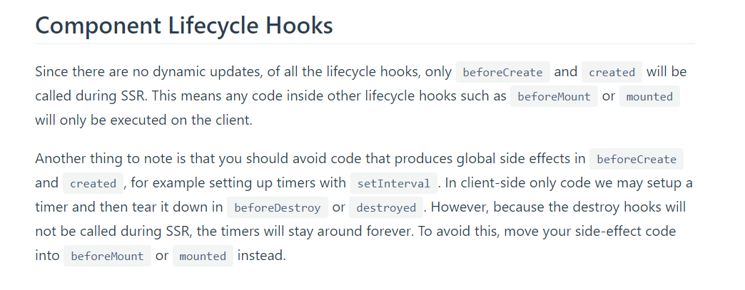 SSR文档中讲到在服务端渲染中只调用这两个生命周期函数。为什么不会调用后面的生命周期呢?是因为Vue对象留出接口来阻止调用还是SSR进行了特殊化处理?