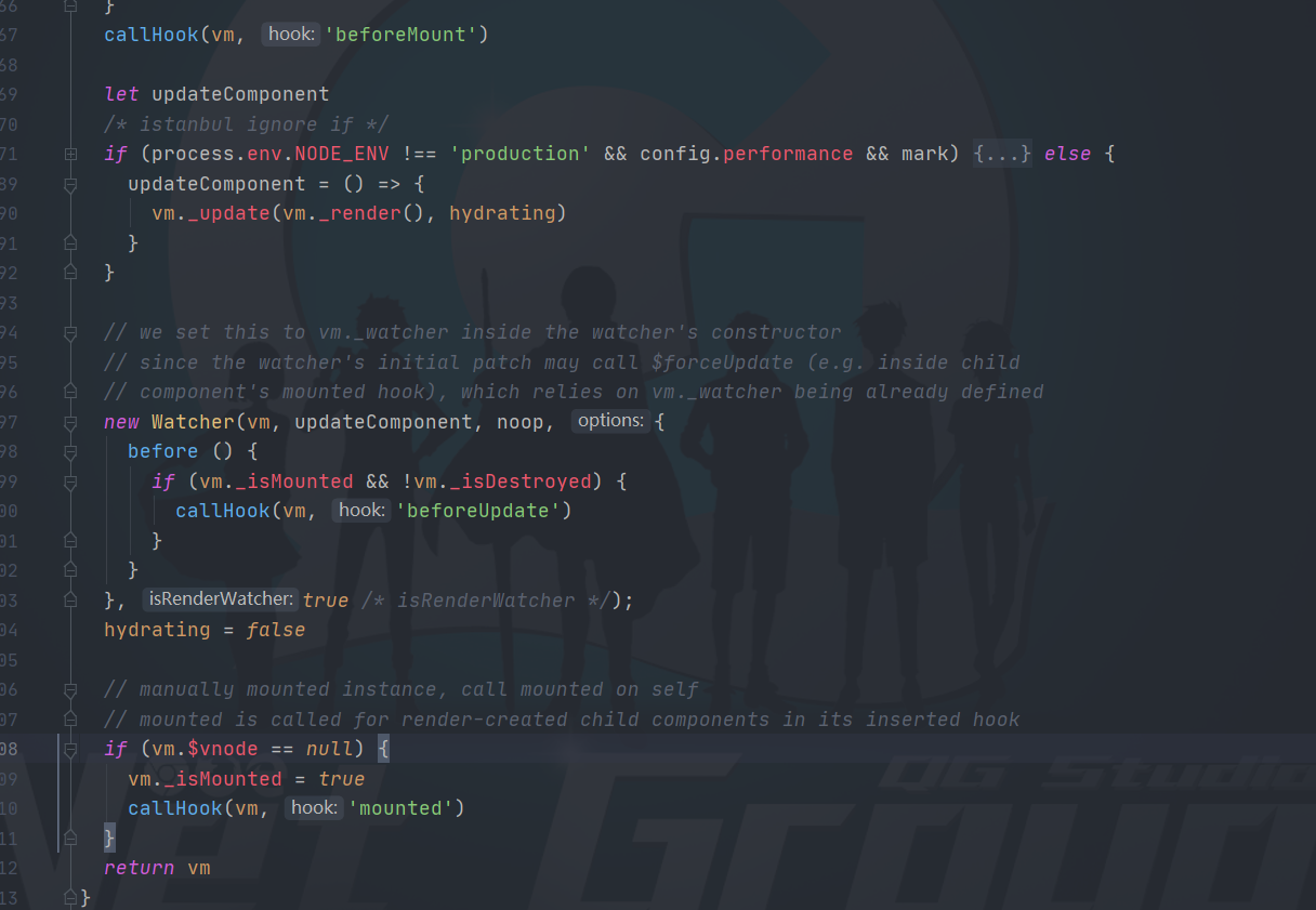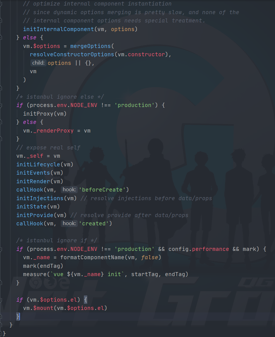 callHook函数是调用实例生命周期的函数。上面的代码在调用new Vue()的时候直接执行,那么理所当然会调用beforeCreate和created生命周期钩子函数。 -