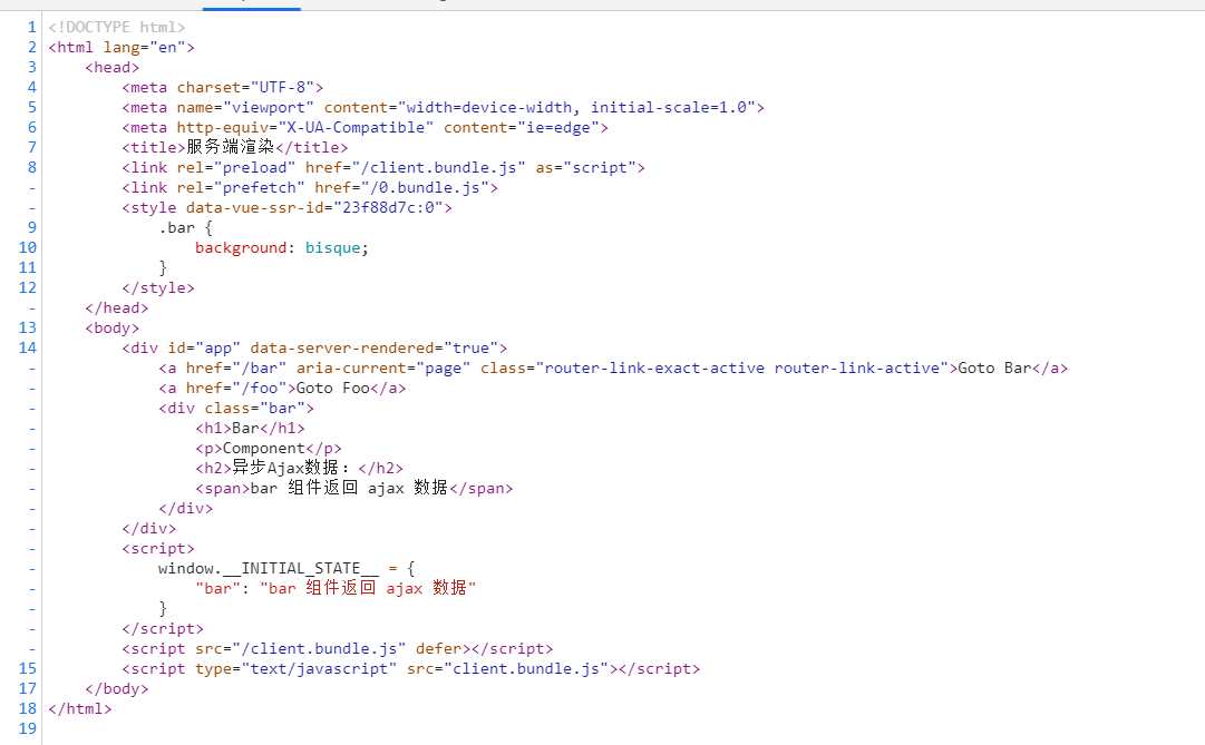 返回内容SSR会比普通的SPA在HTML代码中多出首次渲染的结果,这样在初始化的时候直接将页面进行渲染,无需花费时间去请求数据再次渲染。