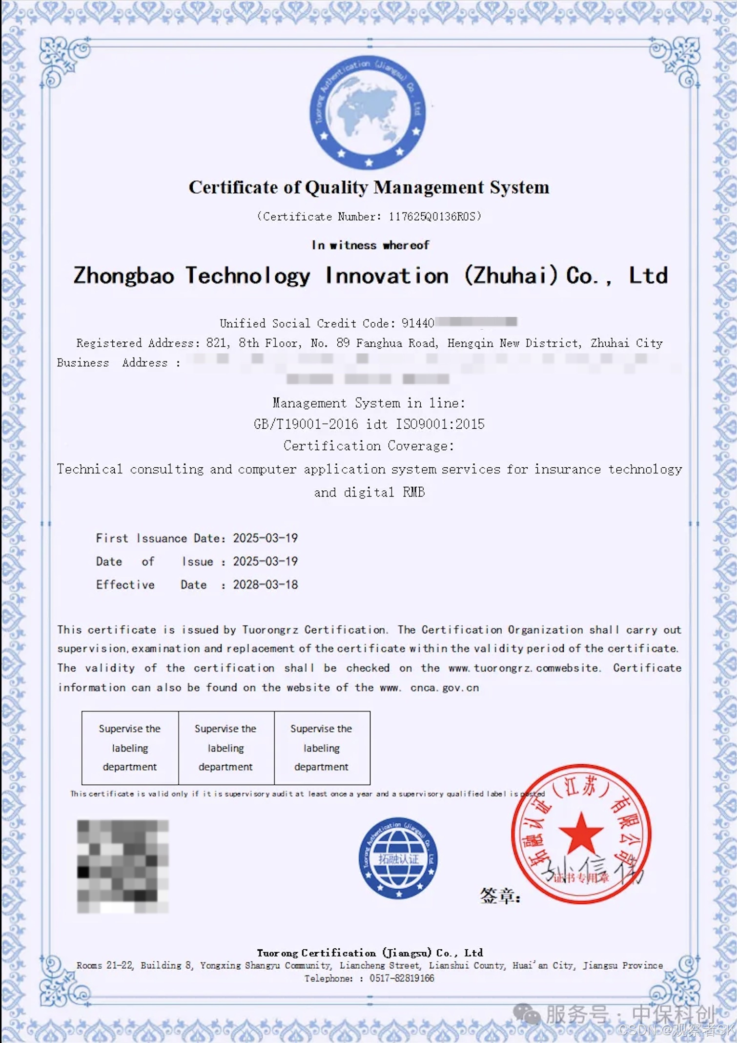近日,中保科技创新(珠海)有限公司凭借卓越的质量管理水平和持续创新的发展理念,顺利通过权威机构审核,正式获得ISO9001质量管理体系认证证书。此次认证标志着公司在规范化、标准化管理道路上迈出关键一步,为高质量发展注入新动能。