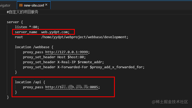 server {listen *:80;server_nameweb.yydpt.com; // 配置的前端服务,用的域名root /home/yydpt/webproject/webbase/development;location /webbase {proxy_pass http://127.0.0.1:9999;proxy_set_header Host $host:80;proxy_set_header X-Real-IP $remote_addr;proxy_set_header X-Forwarded-For $proxy_add_x_forwarded_for;} //代理后端的接口location /api {proxy_pass http://xxx.xxx.xxx.xx:8085;}
