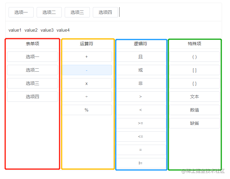上面的已选表单项也通过一个数组来存储,而 “用户可读” 表达式和 “代码可读” 表达式都通过计算属性来监听已选选项数组的改变,再次进行转换。