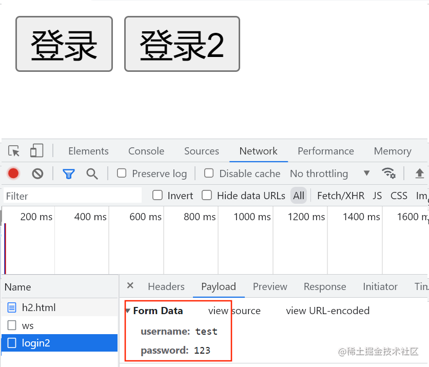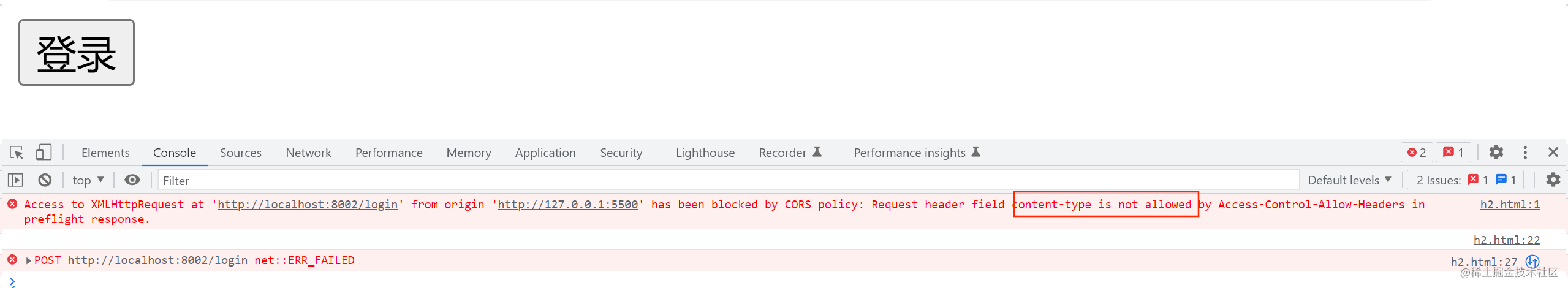 <body><button id="login">登录</button><button id="login2">登录2</button><script> let dom = document.getElementById("login")let dom2 = document.getElementById("login2")url = "http://localhost:8002/login"url2 = "http://localhost:8002/login2"