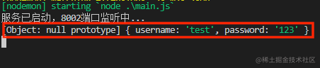但是数据前面有一个Object: null prototype,这个是不影响取值的,按照上面这个例子,我们依旧可以通过req.body.username与req.body.password获取到对应的数据。