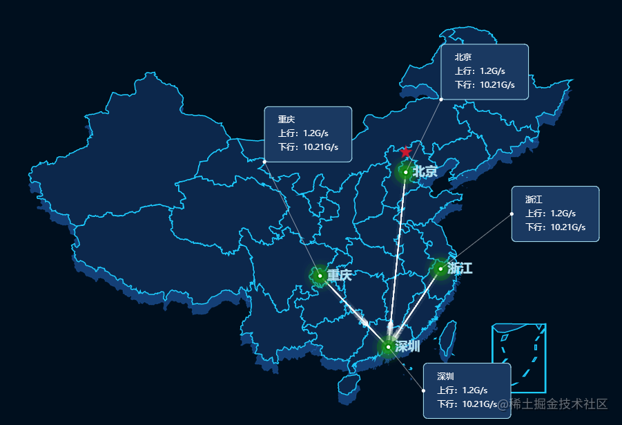 - 最常规的估计就是飞线图,也多示意图性质居多一些,制约的往往是数据的支撑达不到 经典的echarts可以达成很多效果