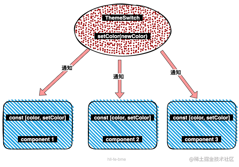 要想达到状态同步,当主题切换组件 ThemeSwitch 改变内部主题状态,执行 setColor(newColor)时,我们只要 通知 其他组件执行同样 setColor(newColor) 操作更新自己的状态就行,这样就达到了状态同步目的: