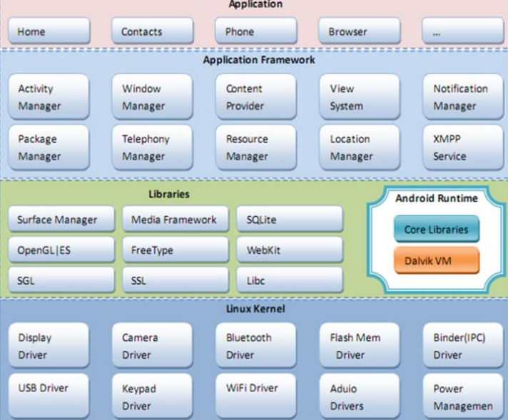 Google官方提供了一张经典的四层架构图,从下往上依次分为Linux内核、系统库和Android运行时环境、框架 层以及应用层这4层架构,其中每一层都包含大量的子模块或子系统。