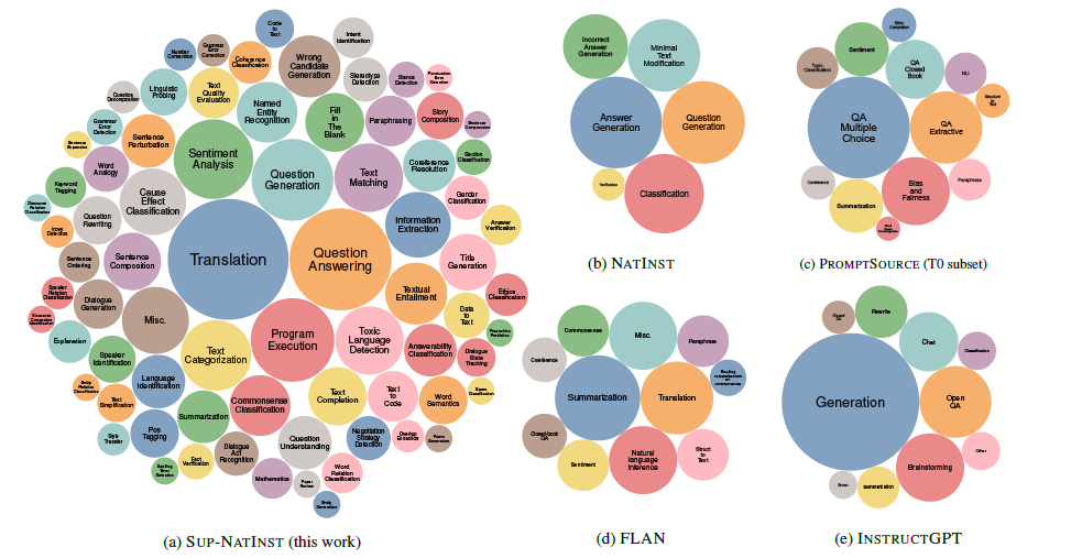 TK-Instruct在76大类,总共1616个任务上构建了指令集,任务分布比T0和Flan更加多样和广泛,比InstructGPT要小(不过因为Instruct GPT的指令更多是开放生成类的用户指令所以不太可比),且占比上还是更偏向标准NLP任务类型。