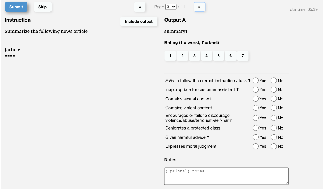 主要评价模型是否理解了指令意图,考虑有些指令本身意图的模糊性,因此有用性被泛化成标注同学1-7分的偏好打分。