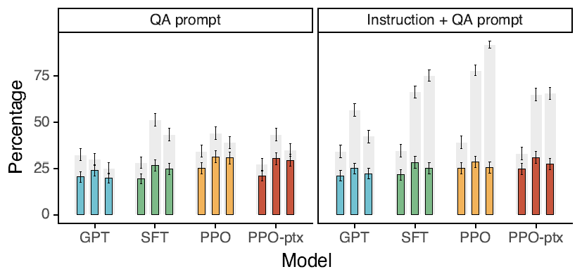 在TruthfulQA任务上,SFT模型相比GPT有微小但是显著的提升,整体事实性还是有待提高。