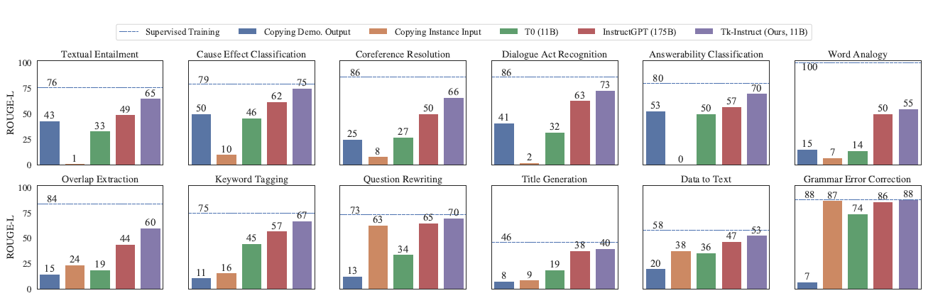 其他细节这里不再赘述,这里放TK-InstructGPT更多是想看下以上T0,InstructGPT,TK-Instruct的效果对比。可以发现在内容理解任务上Tk-Instruct是要显著超越InstructGPT的,在生成类任务上二者差不多。但整体和有监督微调(虚线)相比还有很大的提升空间。这里其实也是我对Chatgpt能力的一些疑虑,不可否认它在拟人化和对话上的成功,但是在标准NLP任务上ChatGPT的水平如何,这一点有待评估,好像又看到最近有类似的论文出来,后面再补上这部分