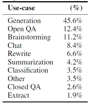 整体上会更偏向于用户在真实场景下和模型交互可能提问的问题,自由式生成例如脑暴,改写,聊天,自由创作类的任务占了绝大多数。 而T0,Flan的指令集集中在NLP的分类和QA任务,这类任务的在实际交互中占比其实很小。下图是OpenAI play ground中收集的用户指令的分布