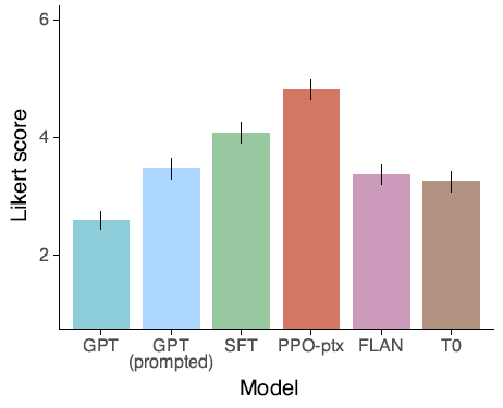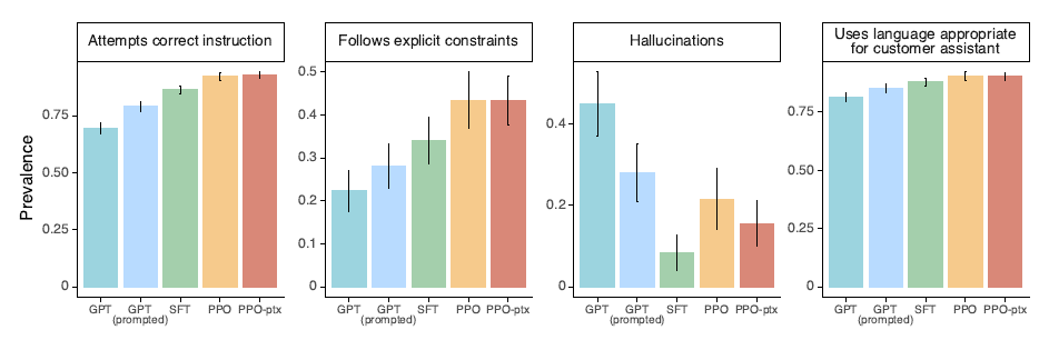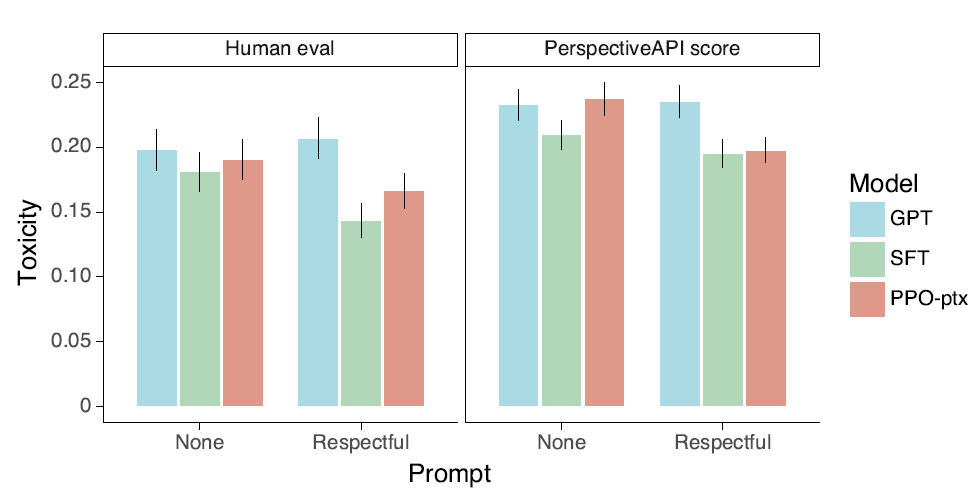 在RealToxicityPrompts数据集上,不管是人工打分还是Perspective模型打分都显示,SFT相比GPT3,在产出有害内容上比例有显著的下降。