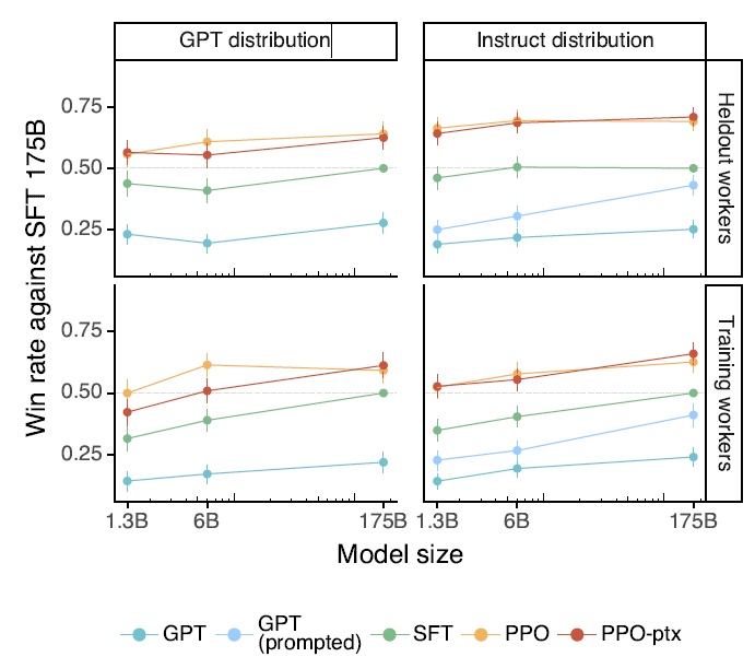 同时论文对比了使用Flan和T0的指令集对GPT3进行微调,发现虽然比原始GPT3有提升,但是效果会显著差于使用更接近人类偏好的指令集微调的SFT。论文给出了两个可能的原因