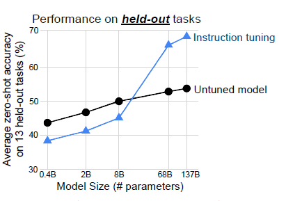 作者进一步论证了指令微调带来的效果提升存在明显的大模型效应,只有当模型规模在百亿左右,指令微调才会在样本外任务上带来提升。作者怀疑当模型规模较小时,在较多任务上微调可能会占用模型本就不多的参数空间,造成预训练时的通用知识遗忘,降低在新任务上的效果。