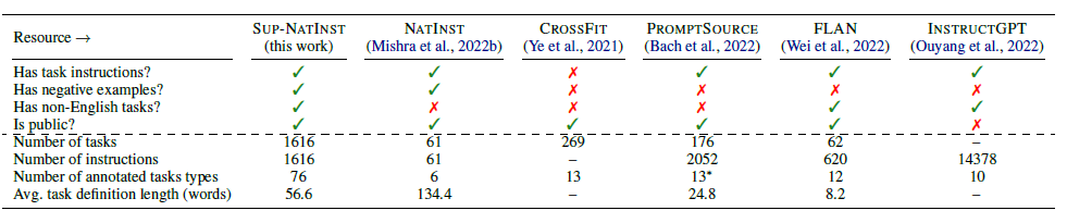 Tk-Instruct最大的贡献在于开源了更大规模的指令数据集,并且对上述提到的T0(promptSource),Flan,InstructGPT指令集进行了对比总结,如下