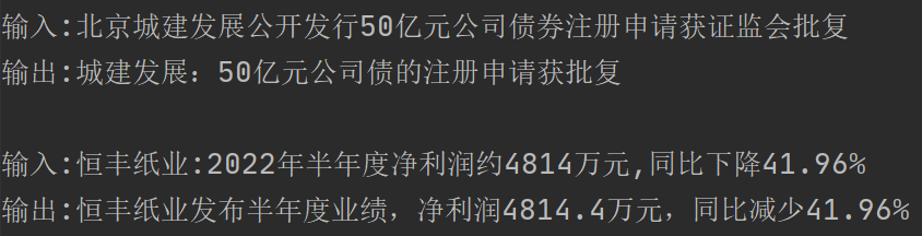 我又采样了两条样本如下,模型预测:“将公司公告或新闻标题简化成简短的标题,包括公司名称和主要内容”