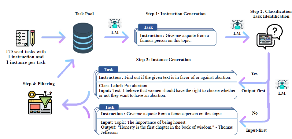 上一步我们依赖APE得到了种子指令集,但是丰富度和多样性是远远不够的。这里SELF提出了一种Bootstrap方案来让LLM基于种子指令生成新的指令的指令扩充方案。这个方案也后续被用于Alpaca项目中生成微调指令集,主要包括以下3个步骤