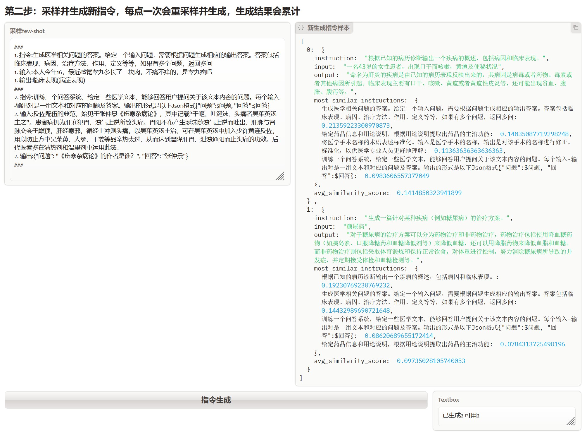 我用上面APE生成的4个医学NLP任务作为种子指令集,每轮采样2个人工,1个机器指令作为few-shot,生成2个新的指令任务。我对以上指令做了些调整,限制只生成医学领域的任务,得到了如下的结果。哈哈我决定去给账户充钱了。。。
