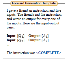 这里作者基于原始的输入+输出,部分样本只有输出,例如自由生成类的任务,来让大模型预测,原始指令是什么。作者把指令生成的模板分成了3类,不过个人感觉其实只要一类即可,就是few-shot样本在前,待生成的指令在最后的向前生成类型,如下图