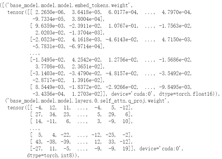 模型量化本质是对浮点参数进行压缩的同时,降低压缩带来的误差。 8-bit quantization是把原始FP32(4字节)压缩到Int8(1字节)也就是1/4的显存占用。如上加载后会发现除lora层外的多数层被转化成int类型如下