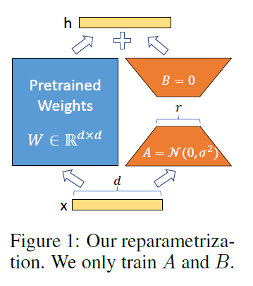 LoRA的原理比较简单,原始全量微调其实就是在原始模型参数上通过微调加入增量\(W = W_0+\Delta W\),那我们可以通过冻结原始参数\(W_0\),并且把增量部分通过低秩分解方式进一步降低参数量级\(\Delta W=A*B^T\),原始参数的维度是\(d*d\), 则低秩分解后的参数量级是\(2*r*d\),因为这里的r<<d,因此可以起到大幅降低微调参数量级的效果,如下图