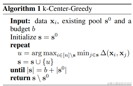 - Corest Sampling:基于聚类结果选择有代表性的样本来构建指令集。我本以为论文会直接从每个cluster动进行随机采样,意料之外的是论文采用了贪心的K-center算法来选取更有代表性的数据点,算法如下。目标是找到K的中心点,使得所有点到距离最近的中心点的距离之和最小化。实现是先用聚类中心点作为起始中心点,遍历所有其他点找到离所有起始点距离最远的点,把这个点也加入中心点,然后多次重复以上过程。