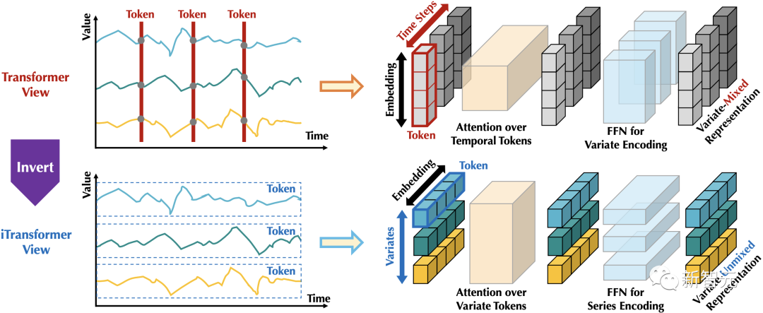 iTransformer框架创新地引入倒置的视角观察时间序列,使得Transformer模块各司其职,针对性完成时序数据两个维度的建模难题,展现出优秀的性能和通用性。