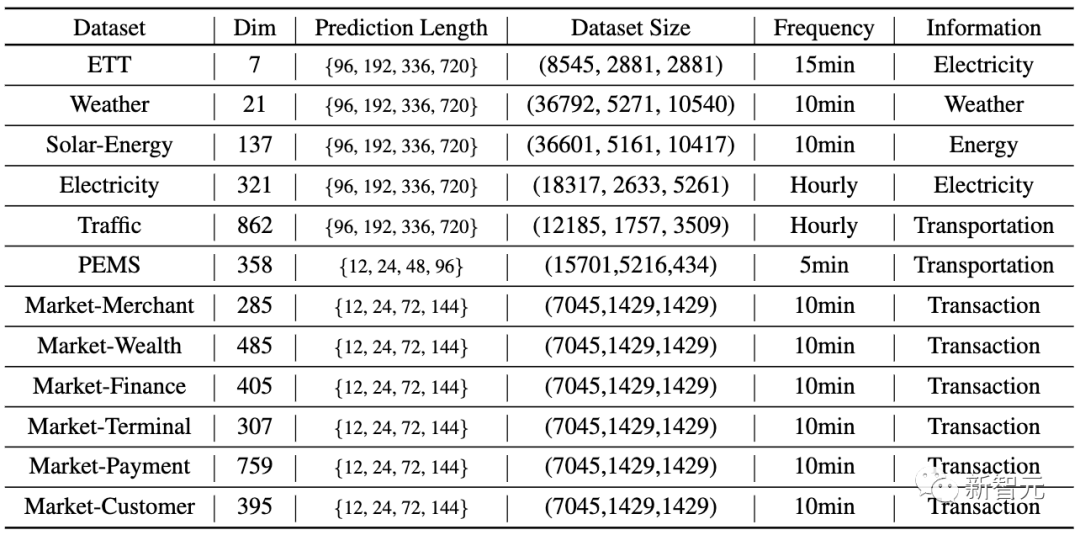 作者在六大多维时序预测基准上进行了广泛的实验,同时在支付宝交易平台的线上服务负载预测任务场景的数据(Market)中进行了预测。