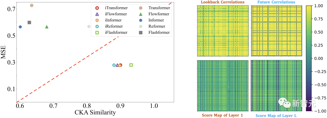 作者对倒置前后的模型分别计算底层-顶层CKA,得到了如下的结果,印证了iTransformer学习到了更好的序列特征,从而达到了更好的预测效果。