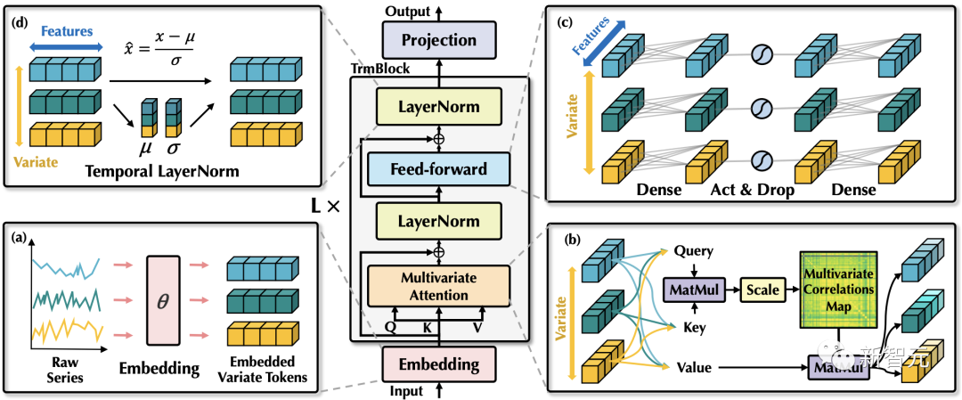 该特征表示将在各层Transformer模块中,首先通过自注意力机制进行变量之间的信息交互,使用层归一化统一不同变量的特征分布,以及在前馈网络中进行全连接式的特征编码。最终通过投影层映射为预测结果。