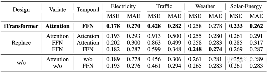 作者进行了消融实验验证iTransformer模块排布的合理性。结果表明在变量维使用自注意力,在时间维上使用线性层的建模方式在绝大部分数据集上都取得了最优效果。