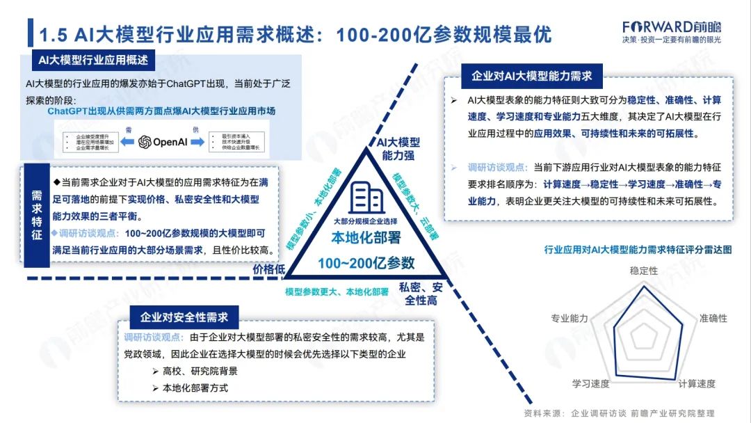- 需求方面:企业用户倾向于选择参数规模在100~200亿之间的AI大模型,偏好本地化部署。