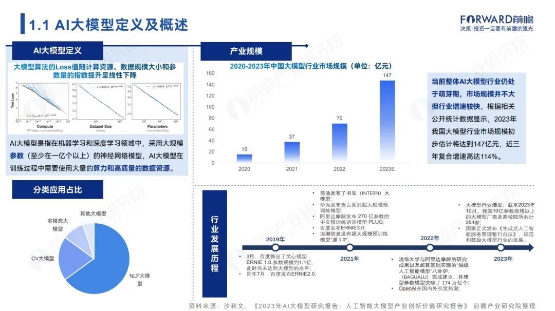 - 2023年中国AI大模型行业规模达到147亿元,预计未来几年将保持高速增长。