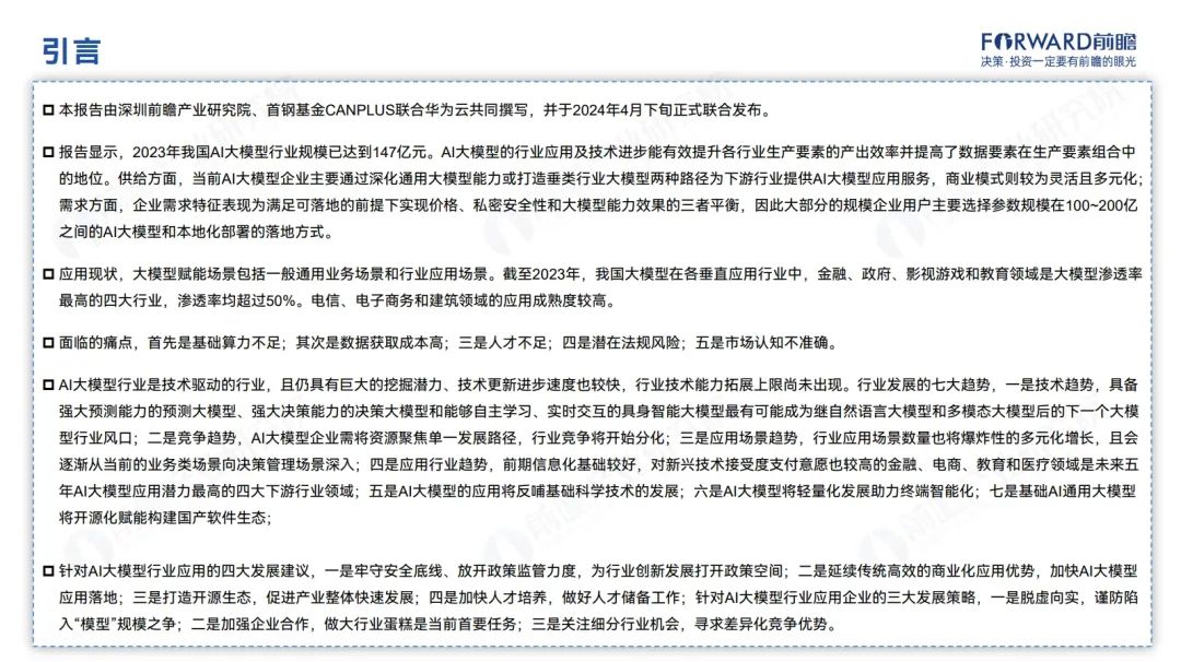 《2024年中国AI大模型场景探索及产业应用调研报告》,由深圳前瞻产业研究院、首钢基金CANPLUS、华为云共同出品。报告主要探讨了中国AI大模型在不同行业场景中的应用现状、痛点、解决方案以及未来的发展趋势和投资机会。