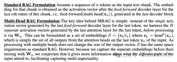 为了解决这一问题,多头RAG(Multi-Head RAG,简称MRAG) 对经典RAG进行了深度优化。在MRAG架构中,Transformer的多头注意力机制取代了传统RAG依赖的解码器层激活,通过并行处理多个文档的嵌入来提升模型对复杂查询的处理能力。