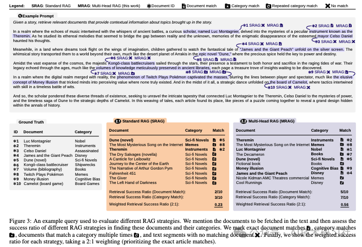 例如,在处理“亚历山大大帝开了哪辆车?”这类查询时,RAG需要同时检索历史人物和汽车制造相关的文档。然而,由于这两类文档的嵌入可能在空间中相距甚远,经典RAG可能无法高效地同时检索到两者。而MRAG通过多头注意力机制并行处理这些内容,不仅提高了检索效率,还增强了模型整合多样化信息的能力。